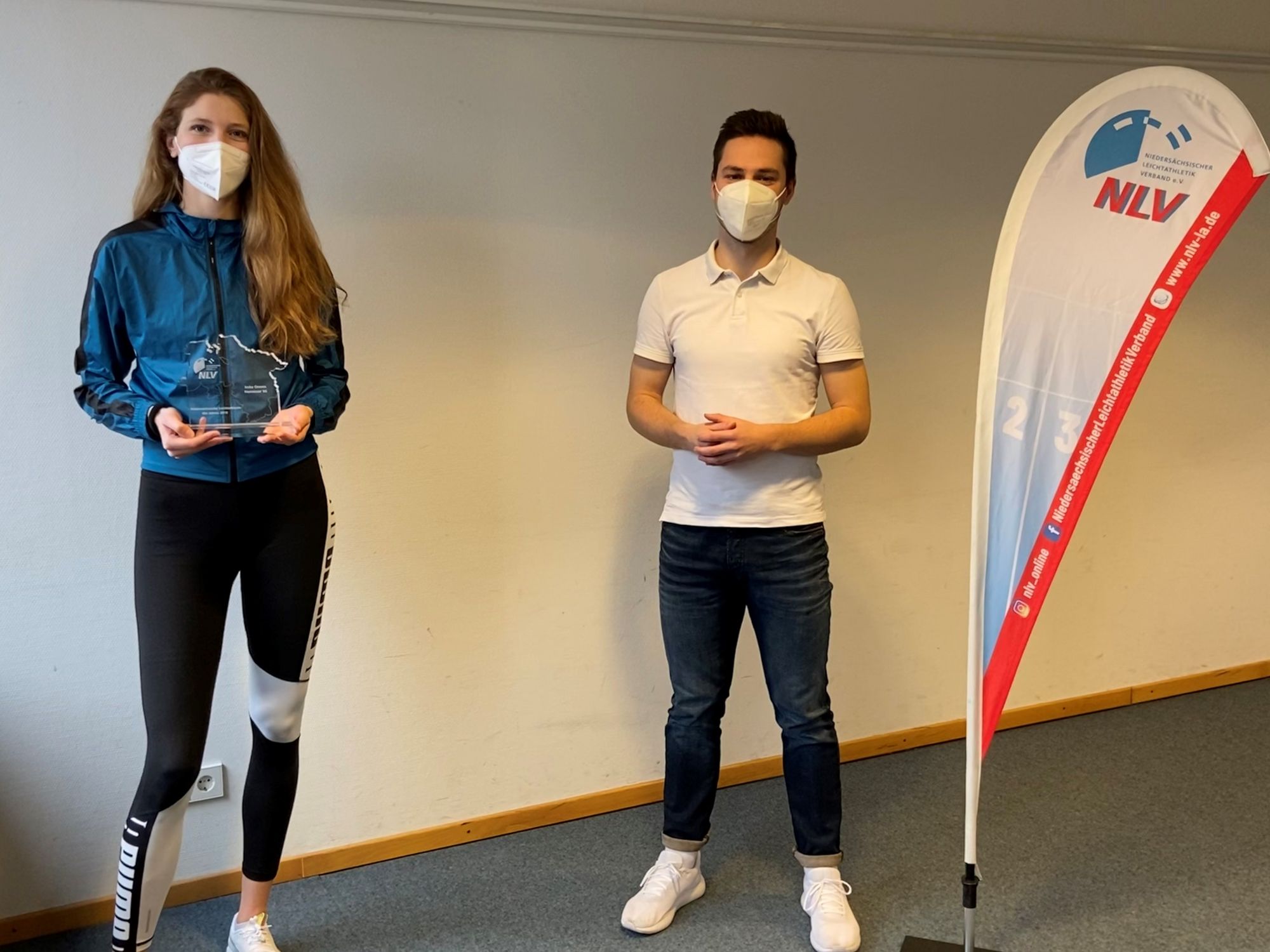 Foto: NLV-Vizepräsident Jugend Jan Gutzeit überreichte Imke Onnen ihre Trophäe mit der Auszeichnung „NLV-Sportlerin des Jahres 2020“ im Rahmen eines Videodrehs