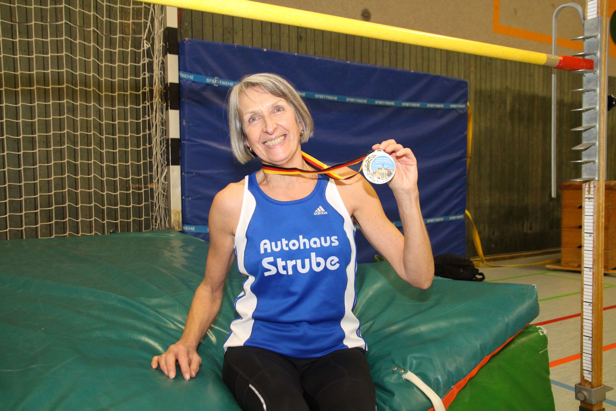 Ebenfalls Deutsche Meisterin wurde Jana Müller-Schmidt von der SG Osterholzer LA. Im Kugelstoßen der W60 katapultierte sie das drei Kilogramm schwere Wurfgerät im dritten Versuch auf 12,64m – ein souveräner Sieg und neue Deutschen Hallen-Bestleistung.