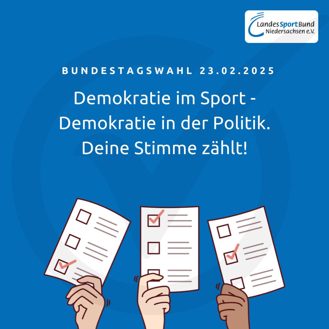 Politisch startet das Jahr ganz im Zeichen der Bundestagswahl 2025. Im Vorfeld des Wahlsonntags am 23. Februar hat der Landessportbund Niedersachsen e.V. einen Wahlaufruf veröffentlicht, dem sich auch die niedersächsische Leichtathletik anschließen möchte: Im Sport sind Werte wie Fairness, Respekt, Chancengleichheit und Solidarität alltäglich und selbstverständlich. Umso wichtiger ist es, diese Freiheit auch innerhalb der Gesellschaft zu wahren. Dazu braucht es eine Demokratie, die durch Wahlen gestärkt und stabilisiert wird. Der Niedersächsische Leichtathletik-Verband bittet deshalb jede Einzelne und jeden Einzelnen, am 23. Februar ein Kreuz zu setzen und diejenigen Kandidat*innen zu unterstützen, die sich für Werte einsetzen, die im Sport und für die Gesellschaft elementar sind.