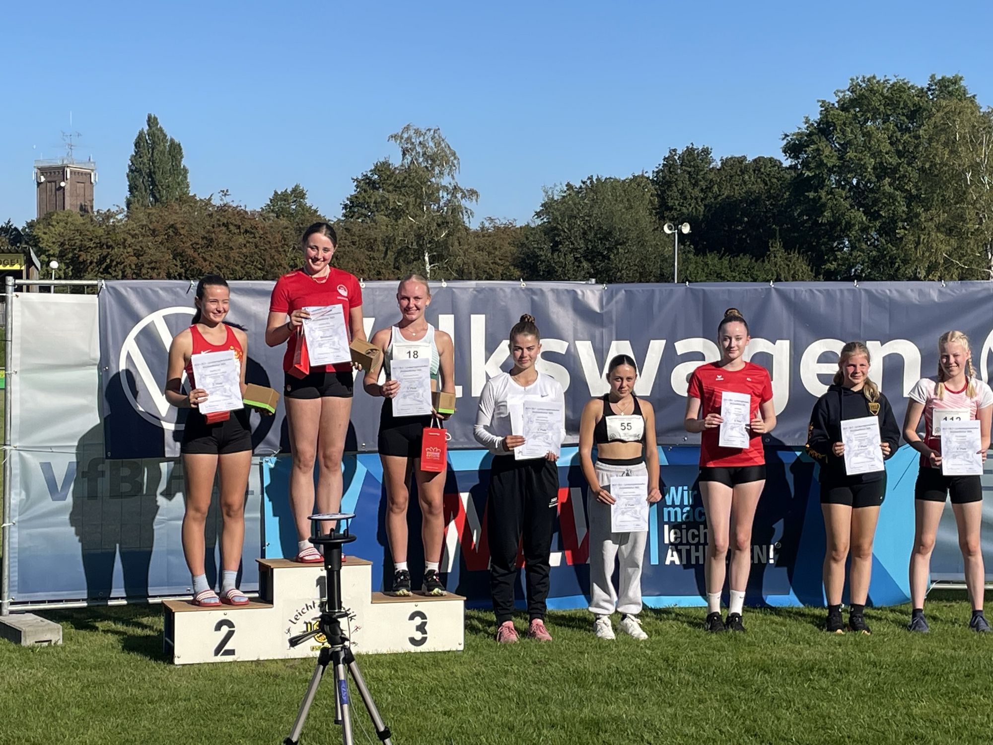 Der VfL Eintracht Hannover gewinnt bei den Landesmeisterschaften in Fallersleben gleich vier Landesmeister-Titel. Quentin Albers gewinnt den Block Wurf in der M15 mit 2.709 Punkten und stellt eine neue persönliche Bestleistung im Diskuswurf über 37,75m auf. Außerdem verbessert er seine persönliche Bestleistung im 80m Hürdenlauf und im Weitsprung. Im Block Sprint/Sprung der M14 trennen die ersten drei Platzierungen nur wenige Punkte. Am Ende gewinnt der Hannoveraner Maximilian Weppler mit nur 14 Punkten Vorsprung den Landesmeister-Titel und stellt dabei eine neue persönliche Bestleistung mit 1,60m im Hochsprung auf. In der Mannschaftswertung der MJ U16 gewinnt ebenfalls der VfL Eintracht Hannover mit 12.486 Punkten und belegt damit Rang 8 in der DLV Bestenliste. Den vierte Landesmeister-Titel für den Verein gewinnt Josefine Birg im Block Wurf der W14 mit 2.512 Punkten. Sie kann sich ebenfalls über den 6. Rang in der DLV Bestenliste und eine persönliche Bestleistung im Diskuswurf mit 27,18m freuen.