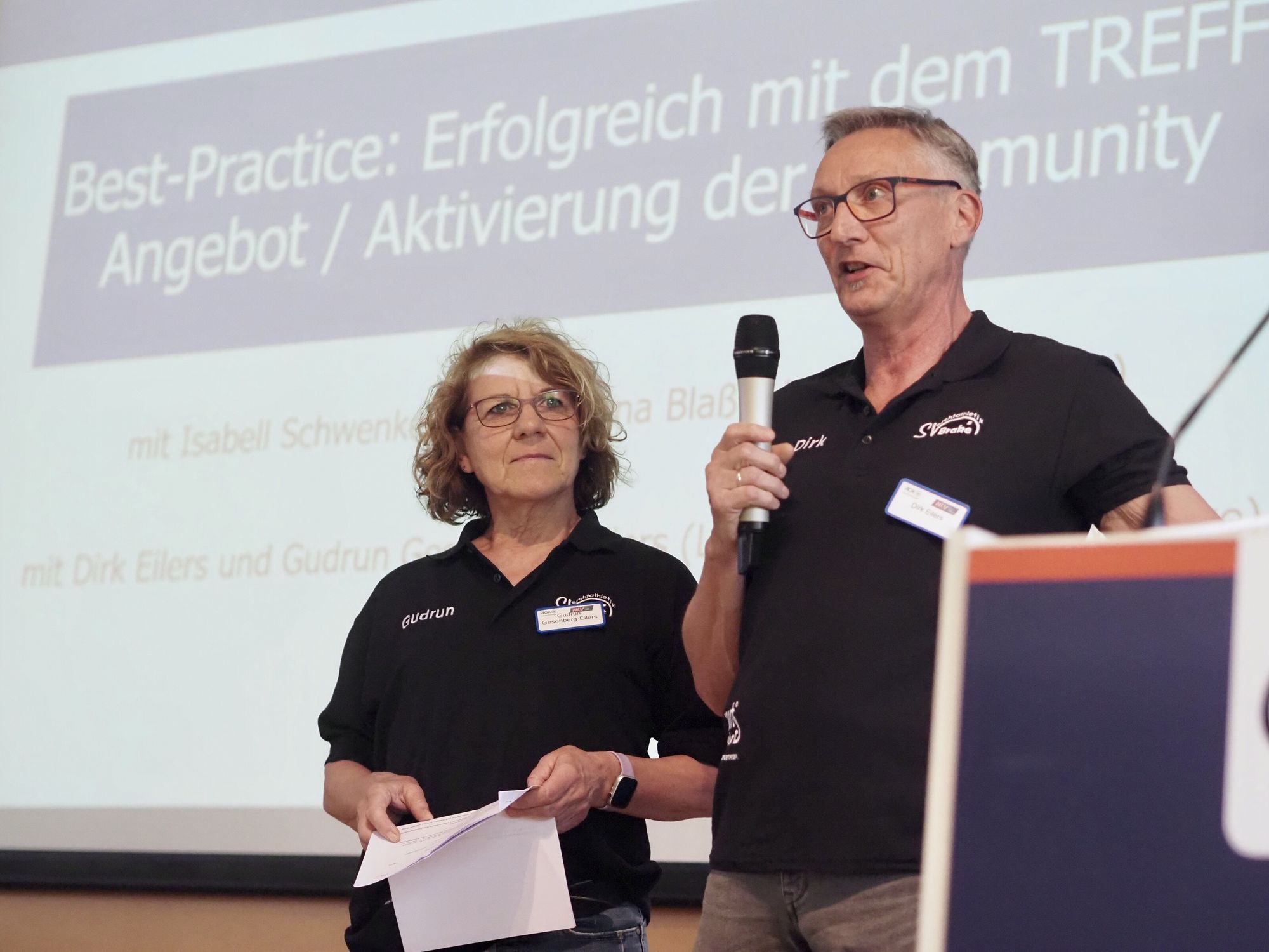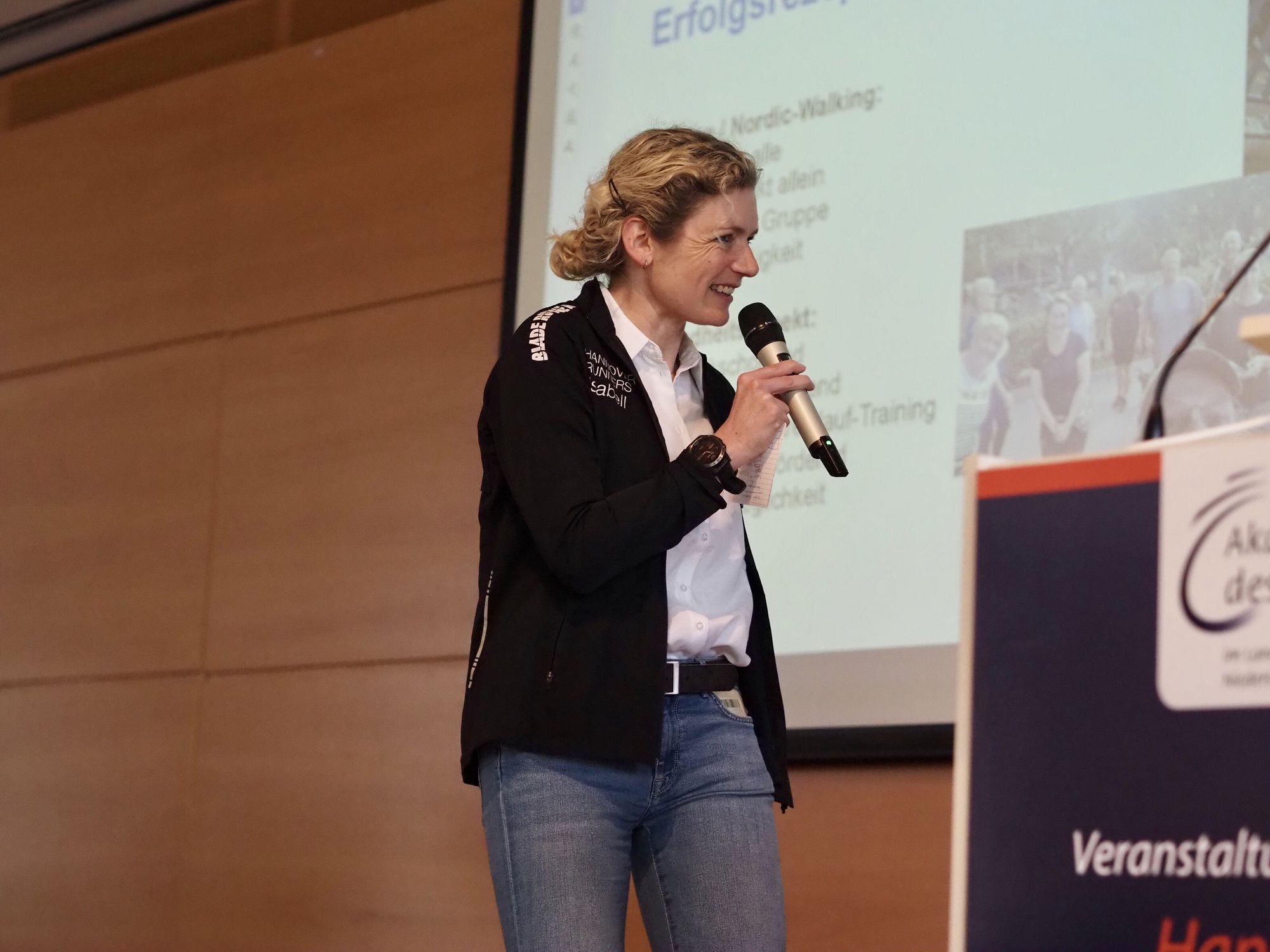 Den ersten Programmpunkt gestaltete Dr. Kristin Behrens, DLV-Seniormanagerin Sportentwicklung. Sie präsentierte nicht nur die Ergebnisse der DLV-Läufer*innen Befragung aus 2022/2023, sondern auch unser brandneues Bildungsangebot: Die bundeseinheitliche Ausbildung zum Lauf- und Walking-Coach! Die Hannover Runners, vertreten durch Isabell Schwenkert und Corinna Blass und das Lauffeuer Brake, vertreten durch Gudrun Gesenberg-Eilers und Dirk Eilers, gewährten inspirierende Einblicke in ihre erfolgreichen TREFF-Konzepte. Sie präsentierten Best-Practice-Beispiele und zeigten, wie es ihnen gelingt, ihre Laufcommunity in Hannover und Bake in Bewegung zu bringen und zu halten. Ruth Sophia Spelmeyer-Preuß, angehende Sportpsychologin und ehemalige Olympia- und WM-Halbfinalistin über 400m, teilte ihre Expertise zum Thema "Lauf- und Walkingcoach als Vertrauensperson". Sie erläuterte die vielschichtigen Herausforderungen, mit denen Coaches in den Vereinen konfrontiert werden und präsentierte verschiedene Möglichkeiten, angemessen damit umzugehen.