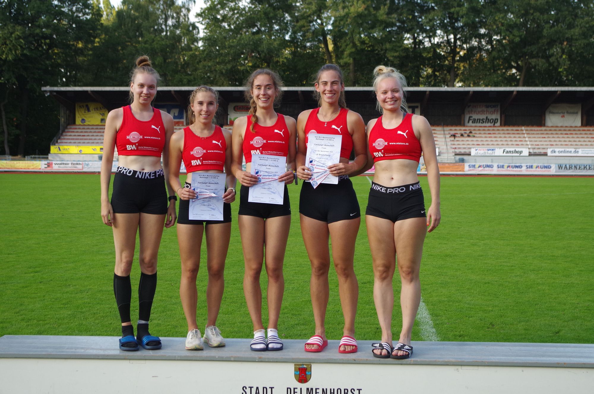 Erfreulich war dabei das große Starterfeld bei den Frauen: Unter den knapp 20 Sportlerinnen setzte sich die Siebenkampf-DM-Teilnehmerin Ann-Kathrin Schmidt (LG Braunschweig) mit einer Gesamtpunktzahl von 3.235 Zählern durch. Gemeinsam mit ihren Vereinskameradinnen Laura Zalewski und Sophia Benkert siegte sie zudem als Fünfkampf-Mannschaft vor den Teams SV Union Meppen und aus Ganderkesee. Bei den Männern konnte sich der Rodenberger Marco Schulz gegen seine zehn Konkurrenten durchsetzen und sich über den Landesmeistertitel freuen.