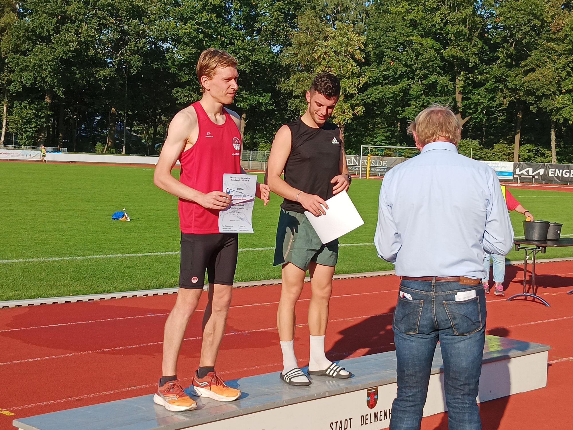 Neben den Fünfkämpfern reisten auch einige Langstreckenläufer nach Delmenhorst. Als Vorbereitung auf die am kommenden Wochenende anstehenden Deutschen Marathon-Meisterschaften in Köln stellte sich unter anderem auch Fabian Kuklinski vom VfL Eintracht Hannover an die Startlinie. Über die 10.000 Meter stoppte seine Uhr nach 33:31,26min. Hannelore Lyda von der SG Bredenbeck-Holtensen erlief sich in der W65 eine Zeit von 48:26,65min und schob sich damit auf Rang drei der DLV-Bestenliste.