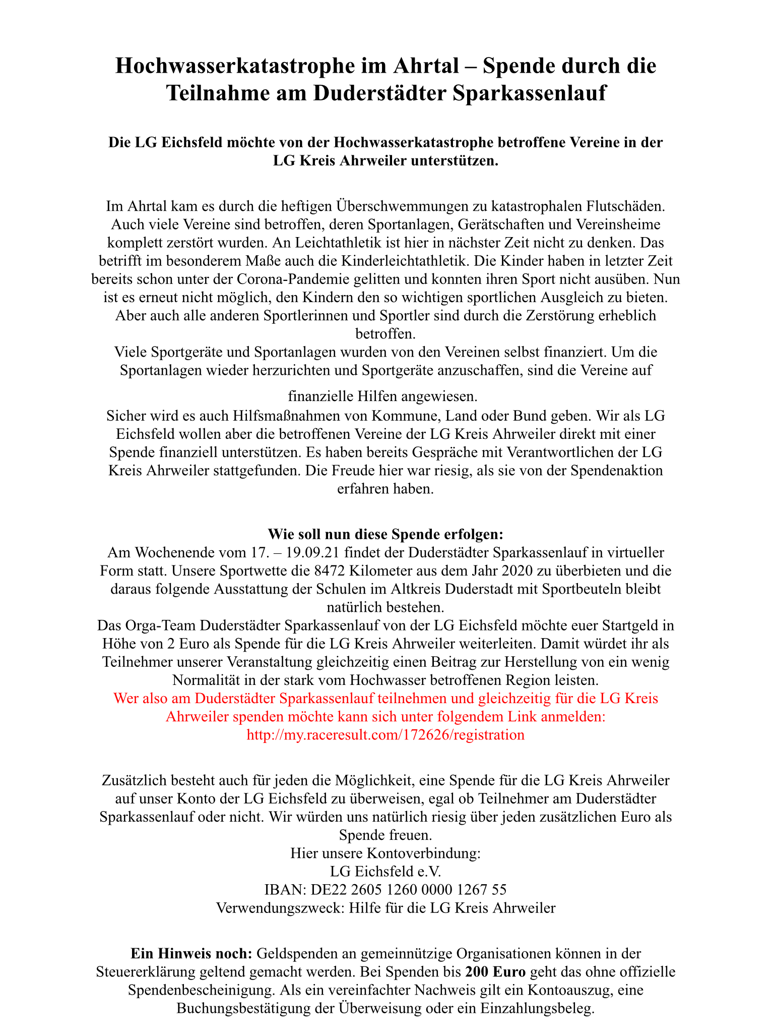 Hochwasserkatastrophe im Ahrtal - Spende durch die Teilnahme am Duderstädter Sparkassenlauf