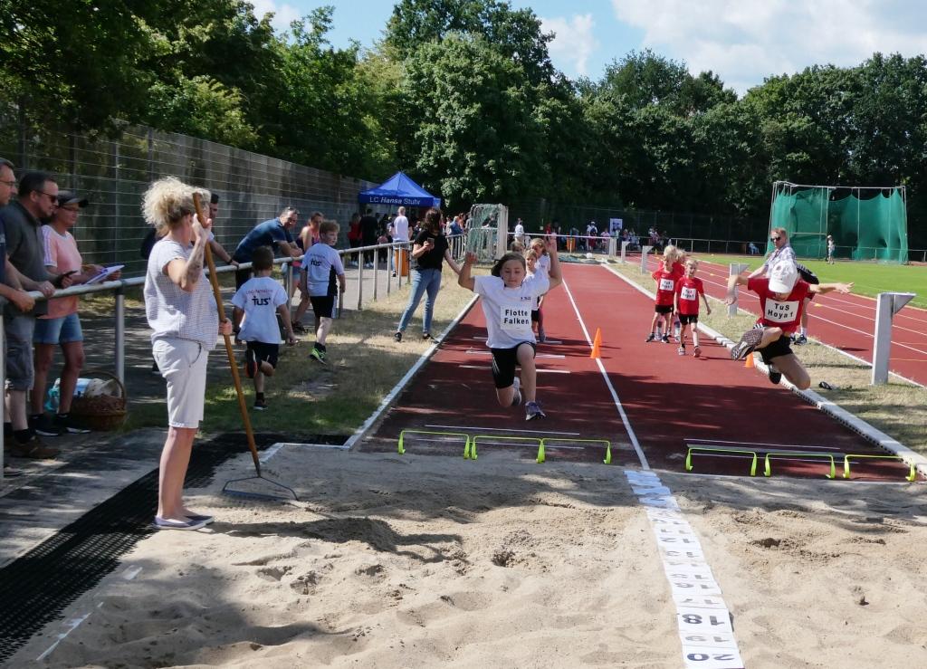 Bei der Neuauflage des KiLa-Cup-Kreisentscheides Diepholz/Nienburg beteiligten sich ca. 80 Kinder aus 10 Teams. Die gemischten Mannschaften aus 7- bis 9-jährigen Jungs und Mädchen gaben sich selbst einen Namen und traten in vier Disziplinen bei strahlendem Sonnenschein in Moordeich gegeneinander an. Zu absolvieren waren die Hindernissprint-Staffel (40 m Hindernis- und Flachsprint), die Weitsprung-Staffel mit Zonenweitsprüngen in drei Minuten, der Drehwurf mit einem Wurfring und der 7-minütige Transportlauf. Belohnt wurden die Kinder mit Medaillen, Urkunden und einem wohlverdienten Eis. Das Siegerteam konnte sich zusätzlich über die blauen Sieger-Shirts freuen.