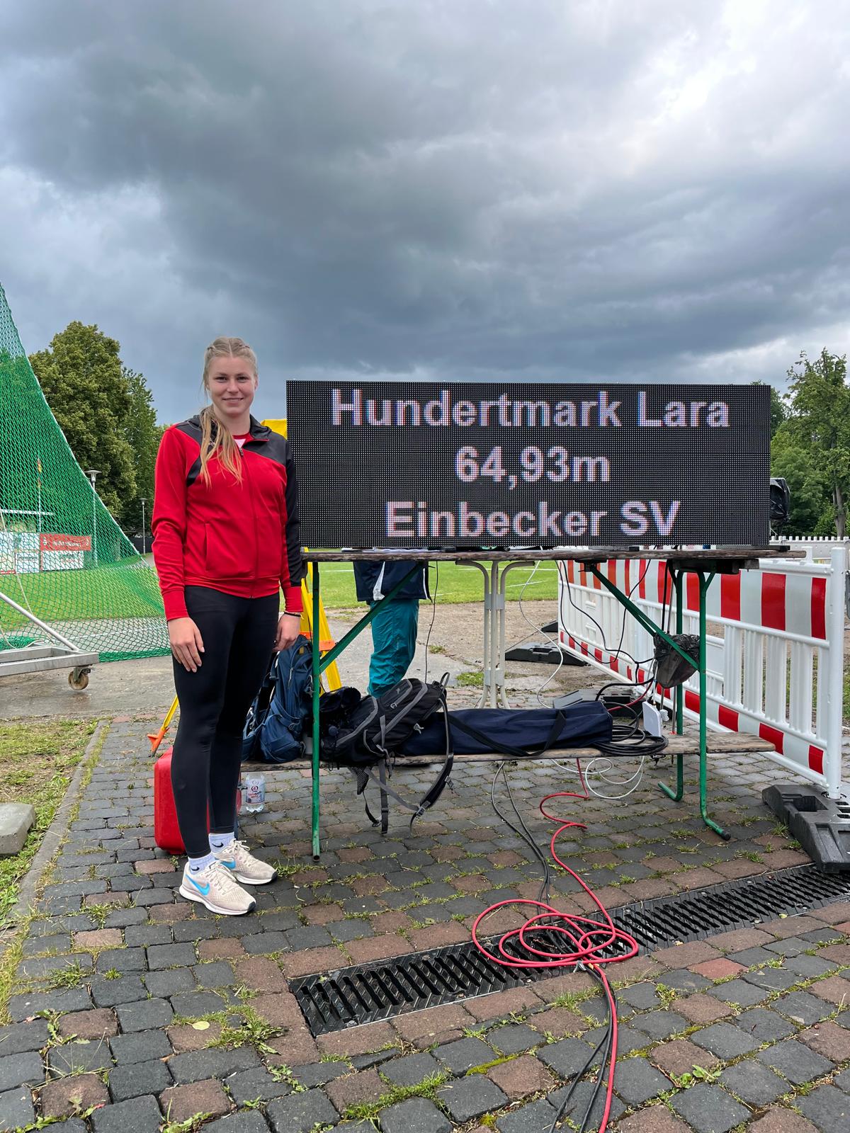 Am Samstagnachmittag ließ Lara Hundertmark vom Einbecker SV in der weiblichen U23 mit einem starken Wettkampf aufhorchen: Mit 64,93 m übertraf sie nicht nur ihre bisherige PB deutlich, sondern auch die U23-EM-Norm von 64,50 m – am Ende Platz 2 und eine stabile Serie um die 63 m.