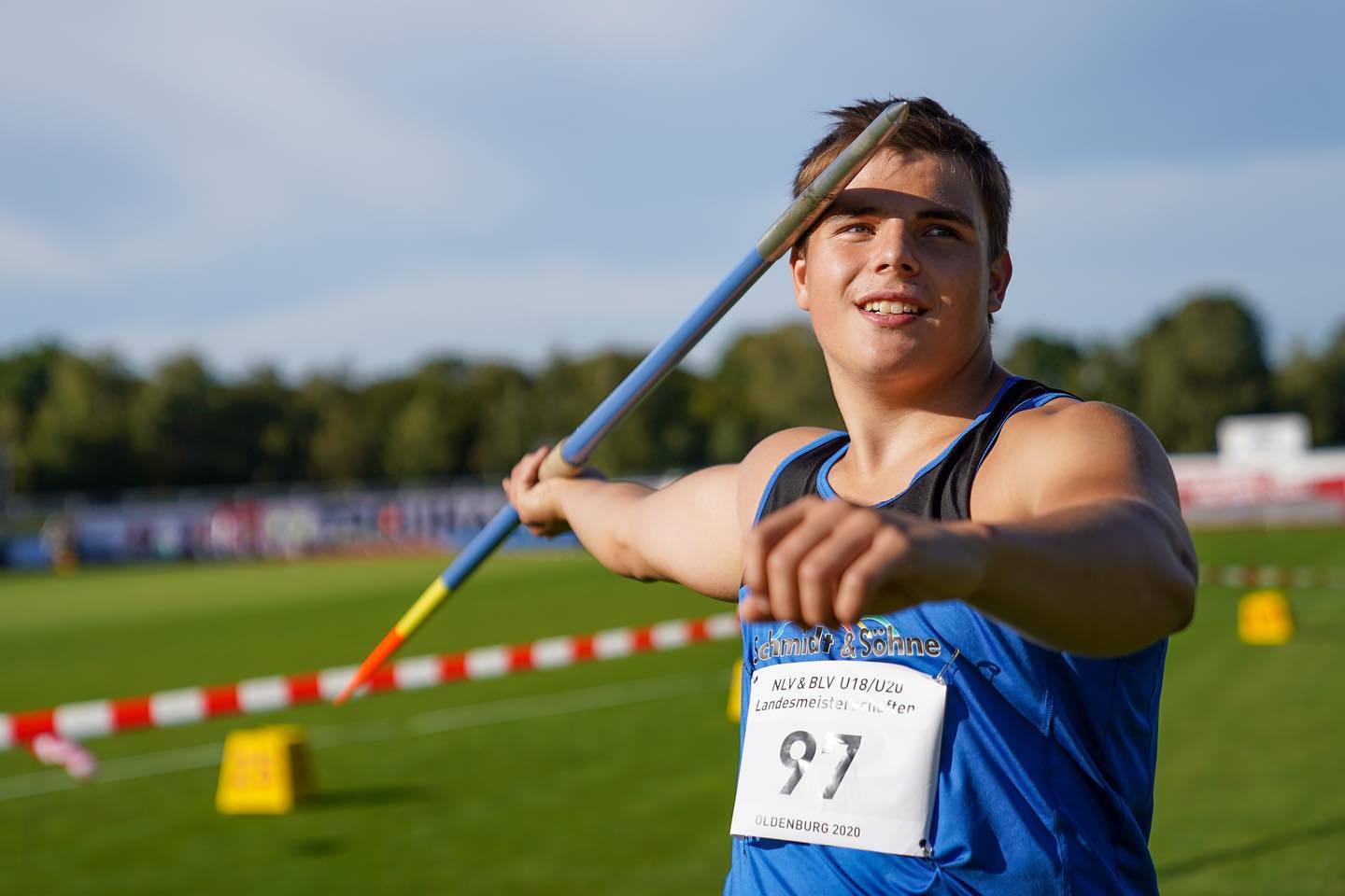 bg (21.09.2020). Mit einem Niedersachsenrekord drückte Speerwurf-Ass Max Dehning (LG Celle-Land) den Landesmeisterschaften der U18 und U20 im Oldenburger Marschweg-Stadion seinen Stempel auf. Dort hatten Niedersachsens beste Nachwuchsleichtathleten bei rundum gut organisierten Meisterschaften und guten Wetterbedingungen am Ende der späten Saison noch einmal die Möglichkeit, starke Leistungen zu zeigen. Einzig der Wind machte es vor allem am ersten Tag einigen Athleten etwas schwer. Dies merkte auch Max Dehning beim Speerwurf, weshalb er sich mit seinem Trainer im Vorfeld abgesprochen hatte, den Speer möglichst flach anzusetzen. Dies klappte im zweiten Durchgang perfekt. Dort segelte der Speer auf 75,57 Meter – eine Verbesserung seines eigenen Landesrekordes, der ihm zwei Wochen zuvor Deutschen Meistertitel beschert hatte. „Ich habe ich mich gut gefühlt, aber mit 75 Metern hatte ich nicht gerechnet. Die Weite ist für mich ein richtig guter Saisonabschluss“, erklärte der 17-Jährige, der sich in Europa damit auf Rang drei vorschob und seine gute Form mit zwei weiteren Würfen über 70 Meter unter Beweis stellte.