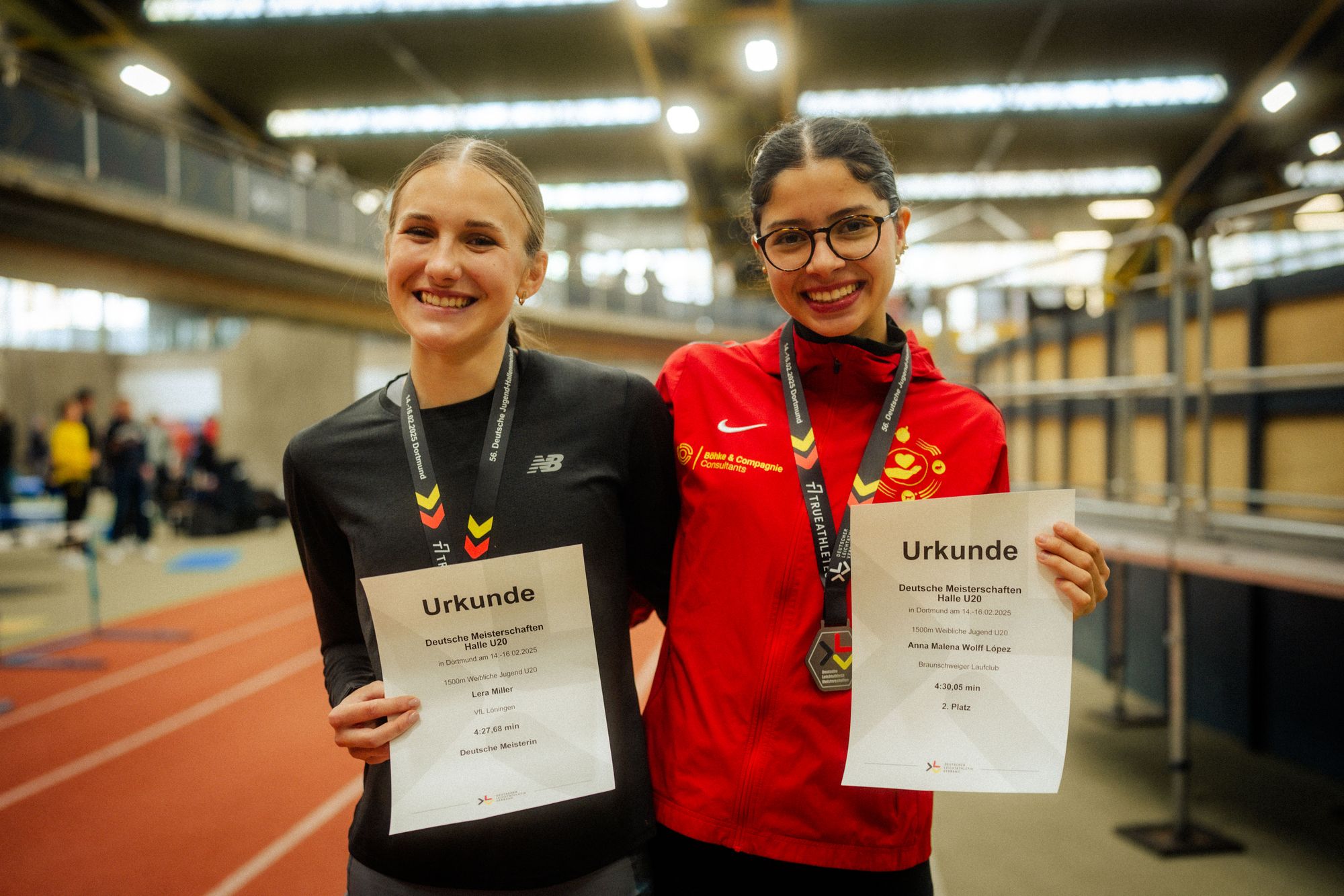 Mit offenen Armen empfangen durfte sie da dann NLV-Kollegin Anna Malena Wolff Lopez: Die Läuferin vom Braunschweiger Laufclub jubelte nämlich über die Silbermedaille, die sie sich souverän und in einer Zeit von 4:30,05min erkämpfen konnte.