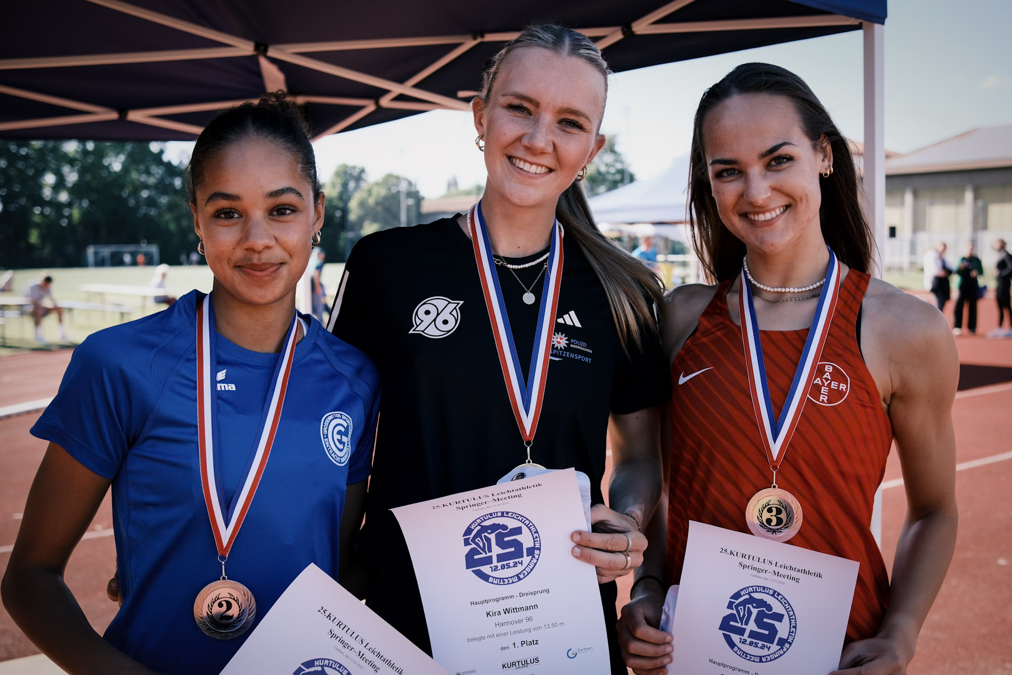 Den Dreisprung der Frauen entschied Kira Wittmann für sich: Der Athletin von Hannover 96 gelang eine Saisonbestleistung von 13,50m. Rang vier belegte Julia Kellner (LG Göttingen) mit 12,67m. Im Dreisprung der männlichen Jugend U18 gab es einen weiteren Sieg für den NLV: Wittmanns Vereinskollege Jakob Henry Lück freute sich sichtlich über seine neue persönliche Bestleistung von 13,60m. In der männlichen Jugend U20 machten drei Niedersachsen den Sieg unter sich aus. Lokalmatador Vincent Martin gewann mit 13,21m vor seinem Teamkameraden Malte Büttner (12,88m) und Aaron Purschweitz (TSV Asendorf).