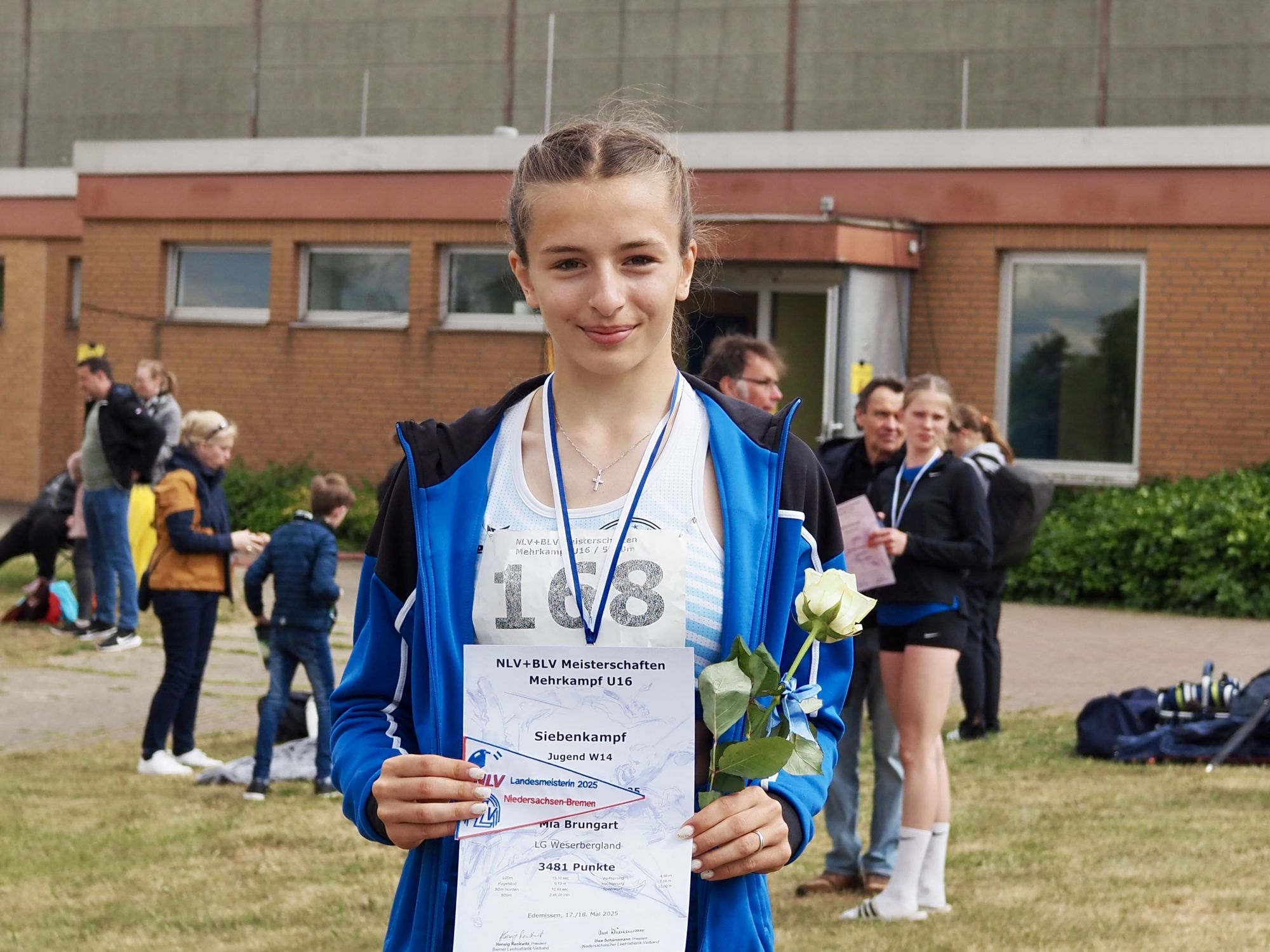 Bei den Mehrkämpfen der W14 verhielt sich das ähnlich wie bei Heller und Co.: Mia Brungart von der LG Weserbergland wurde zweifache Landesmeisterin und Martha Soetebeer (LG Lüneburg) und Iryna Sapozhnikova (LAV Zeven) eroberten jeweils die Silber- und Bronzemedaillen. Brungart freute sich sowohl über die 100m als auch im Speerwurf über neue persönliche Bestleistungen und sprang mit 1,56m so hoch wie noch nie. Eine Gesamtzählerzahl von 3.481 Punkten bedeutet momentan Platz zwei in der Deutschen Jahresbestenliste.