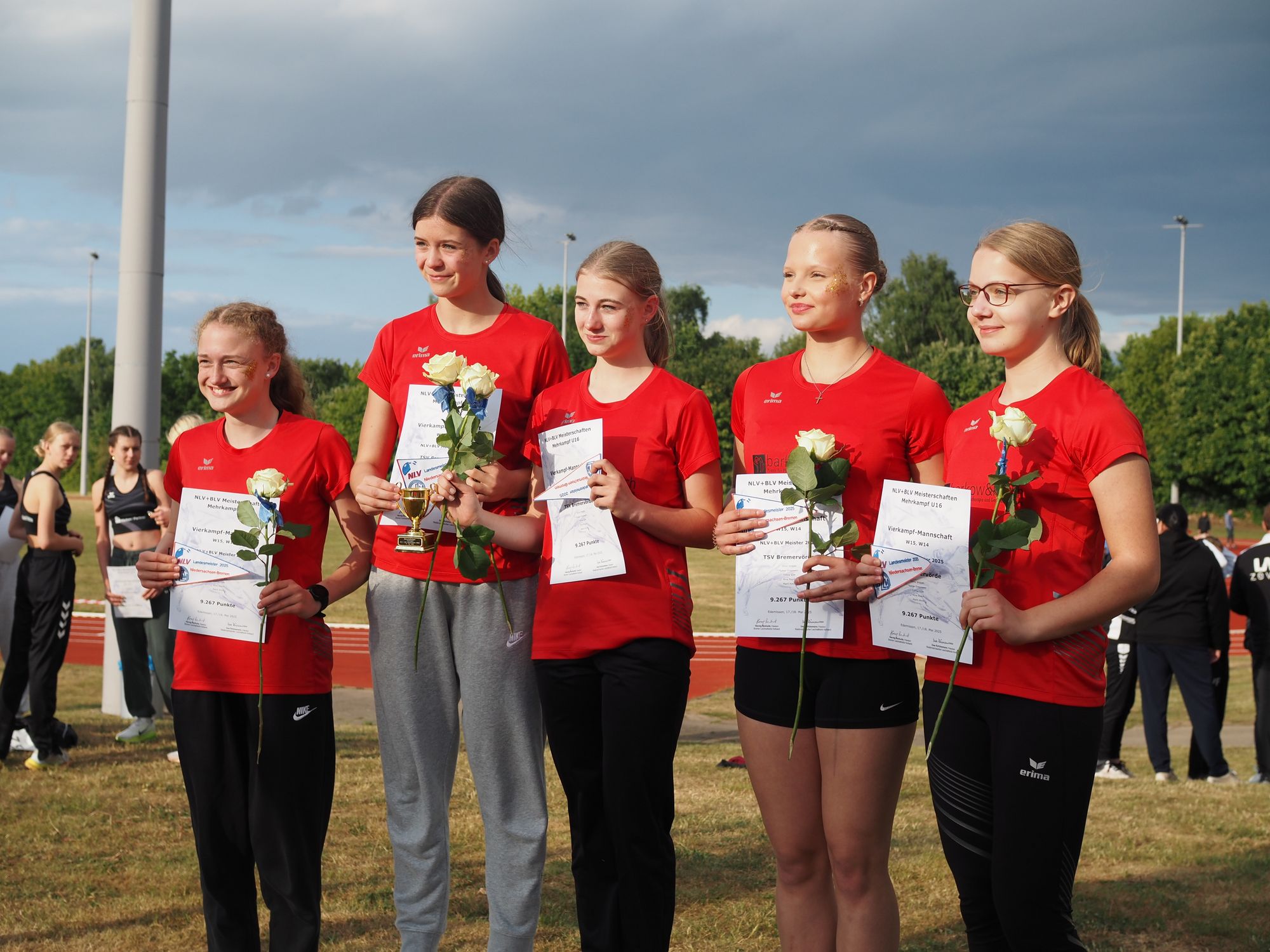 Für eine tolle gemeinschaftliche Atmosphäre sorgten an den langen Wettkampftagen insbesondere die Vereine, die mit mehreren Athletinnen an den Start gingen und um die Meisterwimpel in der Mannschaftswertung kämpften. Am Samstag waren die Athletinnen vom TSV Bremervörde nicht nur am lautesten, sondern auch am stärksten. Stine Wittich, Lahja Diekmann, Tamia Kett, Mina Kosch und Marit Hinck sammelten im Vierkampf 9.267 Punkte und verwiesen den VfL Stade auf Rang zwei. Den Vizemeistertitel sicherten sich die Staderinnen auch in der Siebenkampf-Wertung. Hier wurden Luisa Monsees, Fiona Liesegang und Nele Burkevics vom SV Werder Bremen mit 10.017 Punkten Landesmeisterinnen.