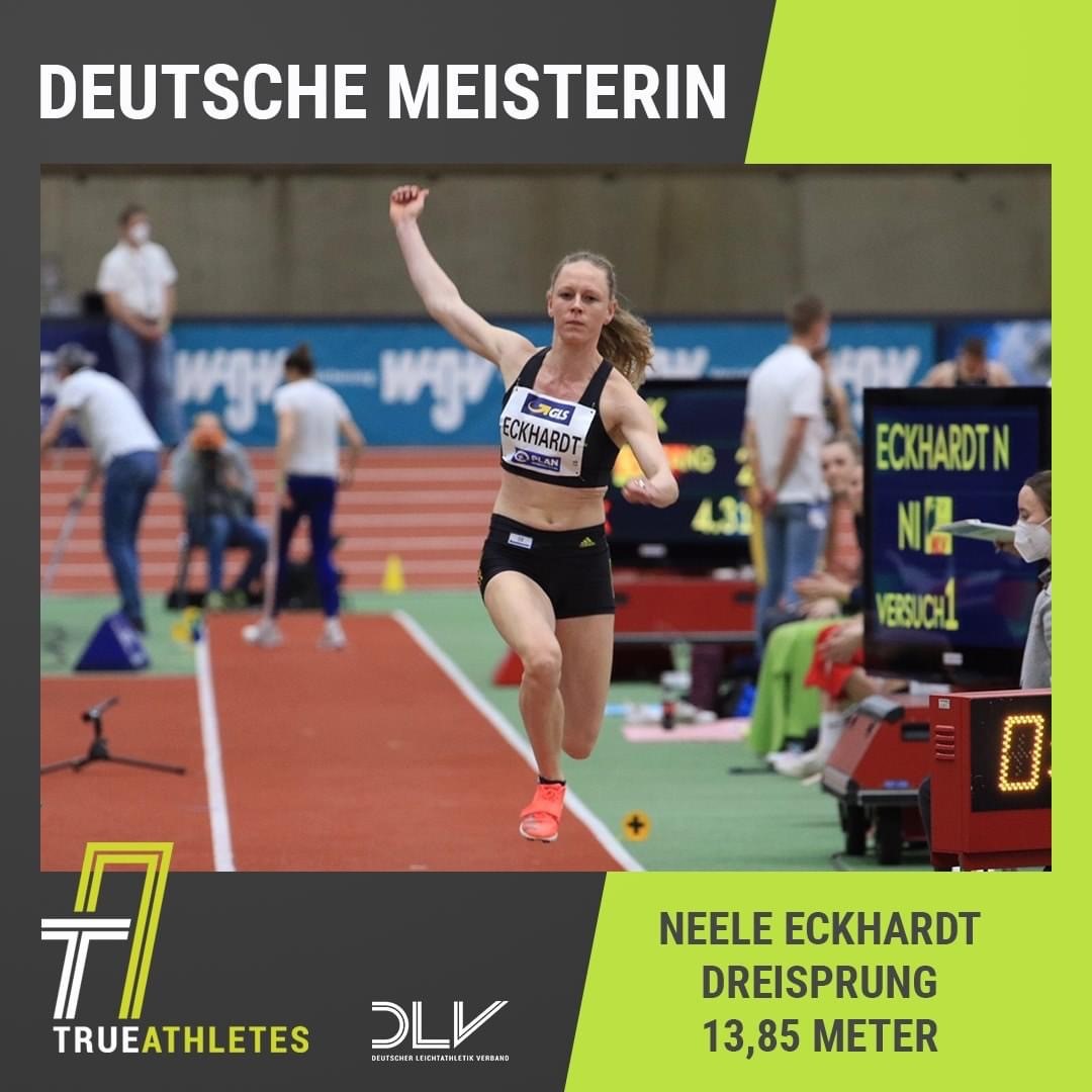 Deutschlands aktuell beste Dreispringerin Neele Eckhardt (LG Göttingen) wurde ihrer Favoritenrolle klar gerecht und siegte ungefährdet mit 13,85 Metern – Mission Titelverteidigung geglückt! „Die Titelverteidigung war das Ziel und das hat geklappt. Ich bin auf dem richtigen Weg. Ich habe ein konstant hohes Niveau und warte auf den Ausrutscher“, bilanziert die Göttingerin ihren Wettkampf und hofft gleichzeitig noch auf einen eventuellen Start bei der Hallen-EM Anfang März im polnischen Torun. „Für den Sommer gilt dann die Devise: so schnell wie möglich die 14,32 Meter für Tokio abhaken“. Im gleichen Wettbewerb sprang Nachwuchs-Ass Kira Wittmann (LG Göttingen) nach einem Jahr verletzungsbedingter Wettkampfpause beim Comeback auf 12,89 Meter und Platz 5.
