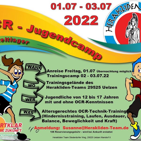 Herakliden-Team – Das Herakliden-Team veranstaltet ein OCR-Jugendcamp mit Zeltlager am 01.-03.07.2022 auf dem Trainingsgelände in Uelzen. Das Angebot richtet sich an Jugendliche zwischen 12 bis 17 Jahren mit und ohne OCR-Kenntnisse. In dem 2 tägigen Jugendcamp geht es darum die richtigen Techniken zu erlernen um Hindernisse schnell, effektiv und verletzungsfrei zu überwinden. Qualifizierte OCR Trainer aus dem Herakliden-Team leiten die Jugendlichen an und gehen dabei mit gutem Beispiel und als Inspiration voran. Die Teilnehmer werden je nach körperlicher Fitness ganz individuell gefordert und gefördert. Es wird viel praktisches Wissen weitergegeben, jeder Jugendliche kann sich ausprobieren und sich austoben, an seine ganz eigenen Grenzen gehen und diese im Laufe des Wochenendes erweitern und überwinden. Natürlich gehört auch ein bisschen Theorie dazu doch der Spaß und die Bewegung stehen im Vordergrund.