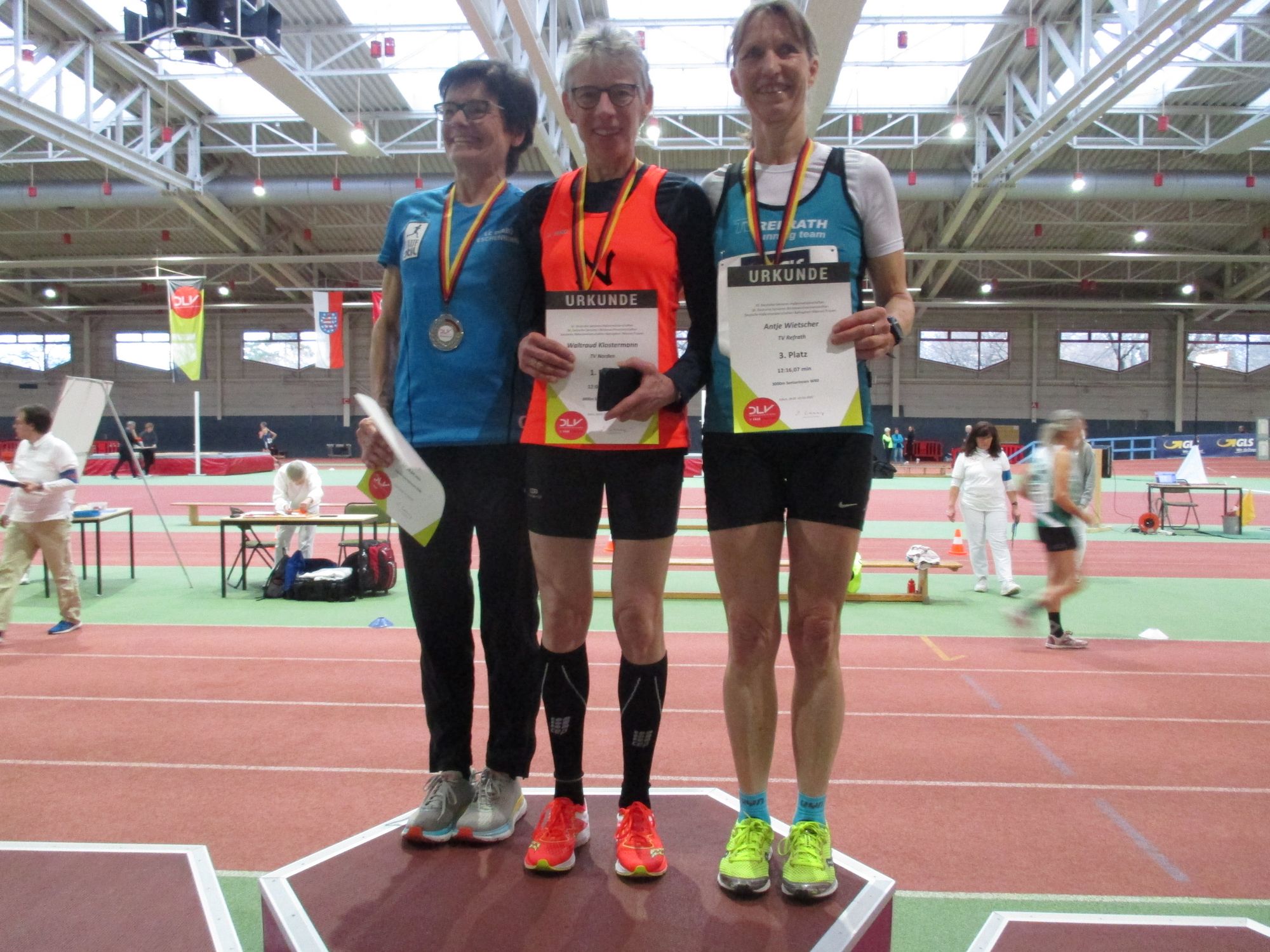 W35: Carola Nowak, TuS Harsefeld, 60m Hürden, sehr gute 9,42 sec., Rieke Stieglitz, SV Friedrichsfehn, 2. 60m, 8,28 sec. und 3. 200m, 26,86 sec., Christina Adolphi, VfL Horneburg, 2. 200m, 26,62 sec., M35: Jens Beintken, 1. 60m Hürden in 9,03 sec. und 3. Weitsprung, 6 Meter, Hans-Jürgen Lay, BTB Oldenburg, 1. im Weitsprung mit 6,33 Metern und 2. 60m in 7,52 sec., W40: Christine Piehozki, MTV Schöningen, 3. im Kugelstoßen, 9,34 Meter und 3. im Diskuswurf, 28,09 Meter. M40: Dennis Seifried, VfL Horneburg, 2. 60m Hürden, 9,12 sec., Marcel Schulz, LG Göttingen, 2. Dreisprung 10,16 Meter und 3. 60m Hürden 10,16 sec., Speerwurf Carsten Nowak, TuS Harsefeld, 3. Speerwurf, 44,95m, Dominik Schrader, Laufclub BlueLiner, 3. 3000m, 9:38,05 Minuten, Torsten Hülsemann, SV Union Salzgitter, 3. Hammerwurf, 34,37 Meter. W45: Miriam Paurat, MTV Schladen, 1. 3000 Meter, 10:43,62 Minuten, Birte Rotkehl, SC Melle 03, 3. Speerwurf, 30,21 Meter. M45: Wolfgang Stobbe, SV Rosche, 3. Hochsprung, 1,66 Meter, Holger Gewecke, TV Lohnde, 2. Weitsprung, 6,28 Meter, Ulrich Krone, SC Osterbrock, 3. Hammerwurf, 36,42 Meter, Lars Hampel, Eintracht Hildesheim, 3. 3000m, 9:56,50 Minuten, W50: Gabi Bauernfeind, TSV Burgdorf, 1. Dreisprung, 9,80 Meter, Grit Kirchner-Fengkohl, Fortuna Wirdum, 2. Dreisprung, 9,36 Meter. M50: Ulrich Pohl, OSC Damme, 2. 800m, 2:12,01 Minuten und 3. 400m 57,91 sec.