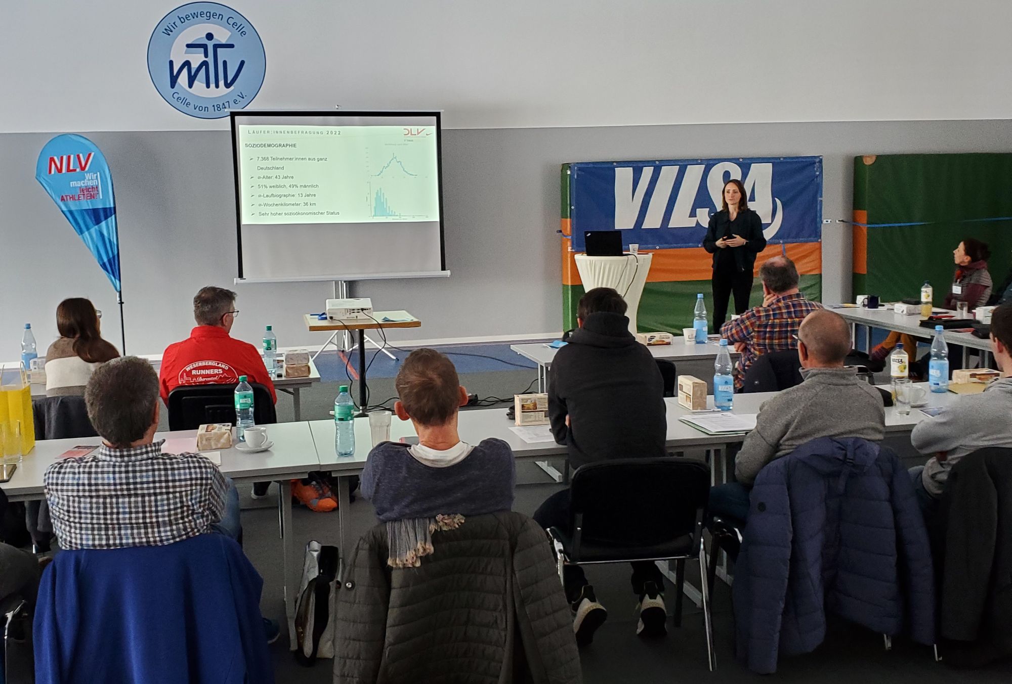 Auf die Talk-Runde folgte ein Beitrag zum Thema DLV-Läufer*innenbefragungen 2022/2023: - So läuft Deutschland- des Deutschen Leichtathletik-Verbandes. Authentisch und unverblümt präsentierte DLV-Vizepräsidentin für Sportentwicklung Dr. Mara Konjer, die vorläufigen Ergebnisse der ersten Befragung und blickte mit den Veranstaltern auf eine zweite geplante Welle, in der verstärkt die Veranstalterperspektive des Laufbereiches eingenommen werden soll. Gleichzeitig würdigte Sie den NLV für die geschaffene Plattform des Servicetages: