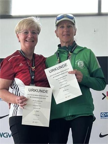 Für Gudrun Klose lagen dort gleich zwei Medaillen bereit: Die Geherin vom Team Laufrausch Oldenburg wurde in 2:24,31min Deutsche Meisterin über die 20km der W55 und sicherte sich zudem die Silbermedaille über die halbe Distanz. Auch Renate Köhler kehrte mit dem Deutschen Meistertitel im Gepäck zurück nach Hause: Die Delmenhorsterin siegte über die zehn Kilometer der W75 in 1:18,09min.