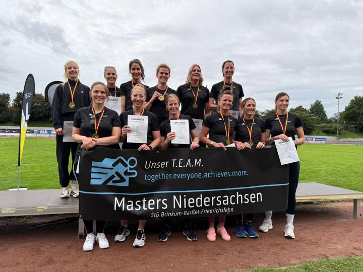 Es waren die vorletzten Nationalen Titelkämpfe in diesem Jahr – und sie standen ganz unter dem Motto „Teamwork makes the dream work“: Bei den Deutschen Team-Meisterschaften der Masters, die am vergangenen Sonntag in Leverkusen ausgetragen wurden, konnte die Startgemeinschaft Brinkum-Barßel-Friedrichsfehn den Wettbewerb in der W30 für sich entscheiden. Die zwölfköpfige Mannschaft sammelte insgesamt 7.050 Punkte und setzte sich in der Endabrechnung gegen drei weitere Vereine durch. Besonders viele Punkte erbrachte den Niedersächsinnen der Sieg ihrer 4x100m-Staffel – sie brachte das Staffelholz nach 51,31sek ins Ziel -, der schnelle Sprint von Lieske Meiners über die 100m, 10,67m von Kira Borgerding im Kugelstoßen sowie ein Doppelsieg im Diskuswurf.