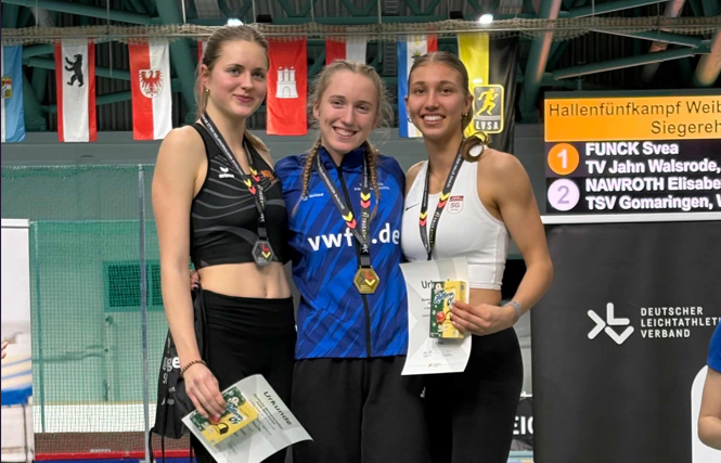 Zwei Medaillen, zahlreiche persönliche Bestleistungen und gelungene Saisoneinstiege: Aus niedersächsischer Sicht waren die ersten nationalen Meisterschaften der Saison 2026 überaus erfolgreich. Bei den Deutschen Hallenmeisterschaften im Fünf- und Siebenkampf sowie dem Bahngehen überzeugte allen voran Nachwuchstalent Svea Funck, die im Hallenfünfkampf der weiblichen Jugend U18 als Titelverteidigerin an den Start ging. Nachdem sie sich im vergangenen Jahr nicht nur zur Deutschen Meisterin gekürt, sondern mit einer Gesamtpunktzahl von 4.178 Zählern auch sensationell eine neue U18-Bestleistung aufgestellt hatte, ließ sie sich an diesem Wochenende von jeglichem möglichen Erwartungsdruck nicht beeindrucken und schnappte sich erneut den Titel. Der Athletin vom TV Jahn Walsrode gelangen nach soliden 8,52sek über die 60m Hürden und starken 1,73m im Hochsprung auch im Weitsprung und Kugelstoßen Weiten, an die ihre Konkurrentinnen nicht herankommen konnten. So startete Funck bereits mit 66 Punkten Vorsprung in den abschließenden 800m-Lauf, wo sie nach einem couragierten Rennen und einem überzeugenden Schlussspurt nach 2:21,93min das Ziel erreichte. 4.164 Punkte erlaubten ihr schließlich den Sprung aufs höchste Treppchen. Leila Bessel vom SV Nienhagen belegte im selben Wettbewerb mit 3.597 Punkten Rang sieben.