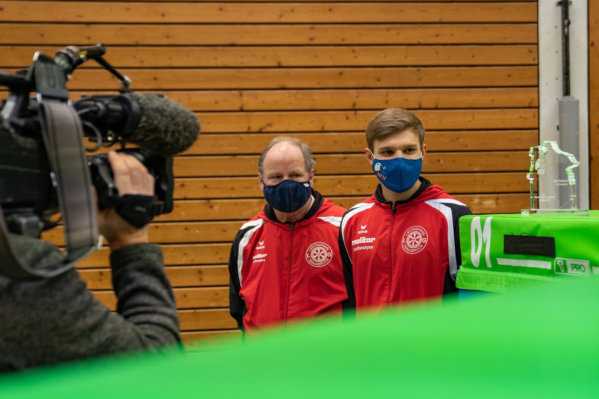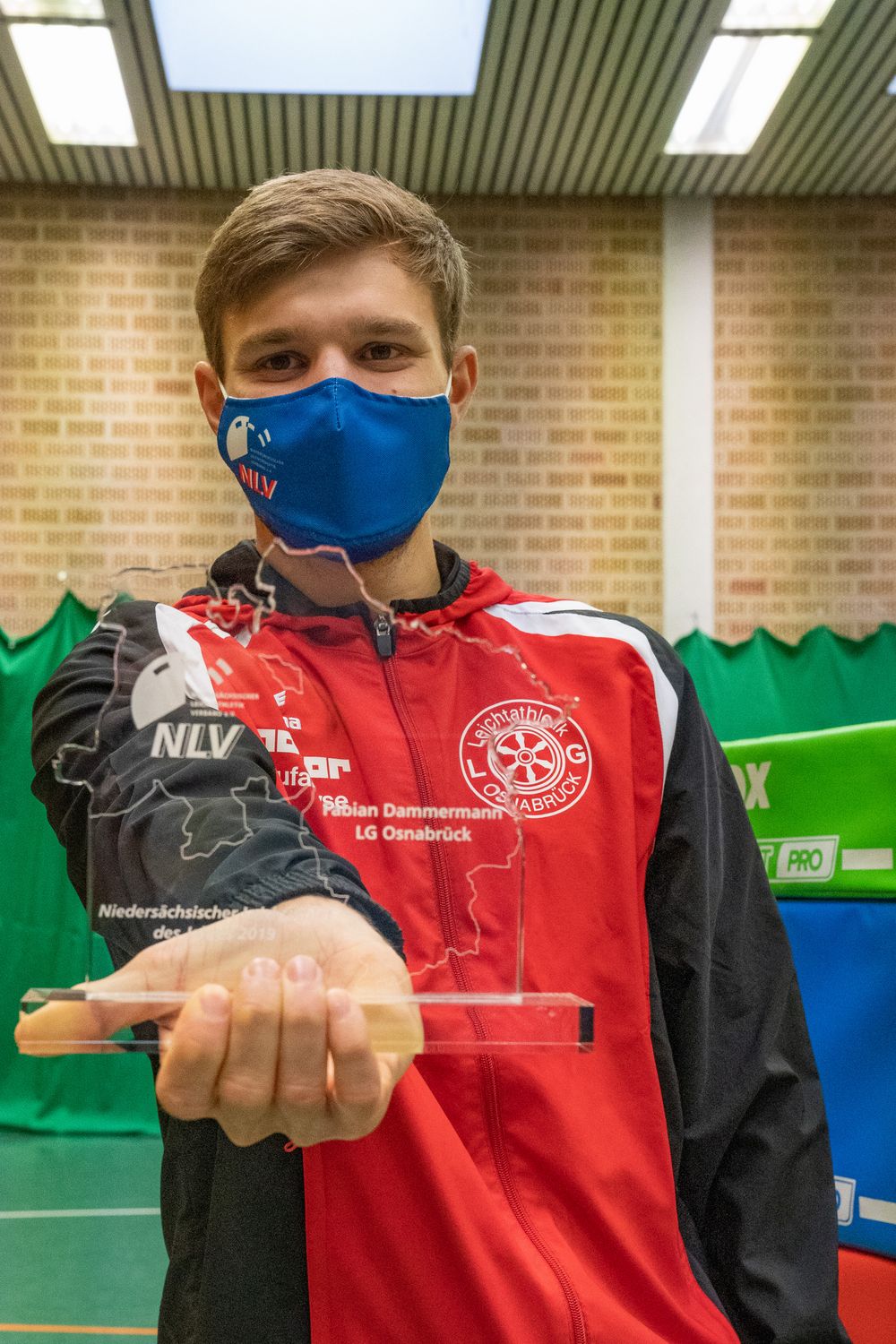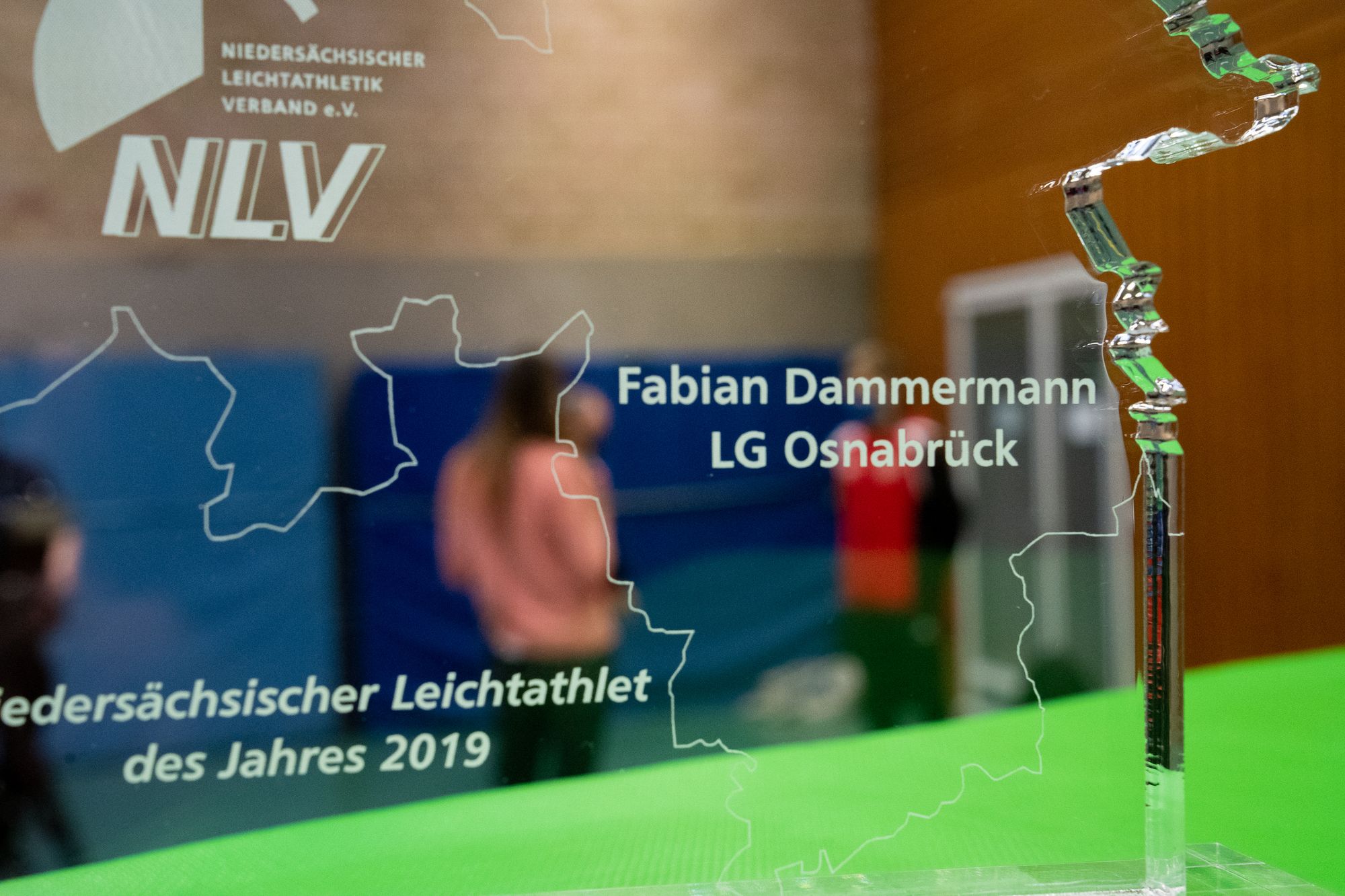 Wegen der Corona-Pandemie gab es 2020 nicht die passende Gelegenheit Fabian Dammermann für seine sensationelle Saison und den daraus resultierenden Titel „Leichtathlet des Jahres 2019“ zu ehren. Feierlichkeiten sind nach wie vor nicht zugelassen. Der Pokal sollte dennoch endlich zu Dammermann finden. Am Rande einer Trainingseinheit wurde er dem Osnabrücker nun coronakonform überreicht, verpackt mit warmen Worten des Vereinsvorsitzenden der TSG 07 Burg Gretesch, Jürgen Bußmann. Aktuell befindet sich der einstige U23-Europameister über die Stadionrunde gemeinsam mit seinem langjährigen Erfolgstrainer, Anton Siemer, in der Vorbereitung auf die Olympischen Spiele von Tokio. Diese wurden ebenfalls wegen der weltweiten Pandemie ins kommende Jahr verschoben.