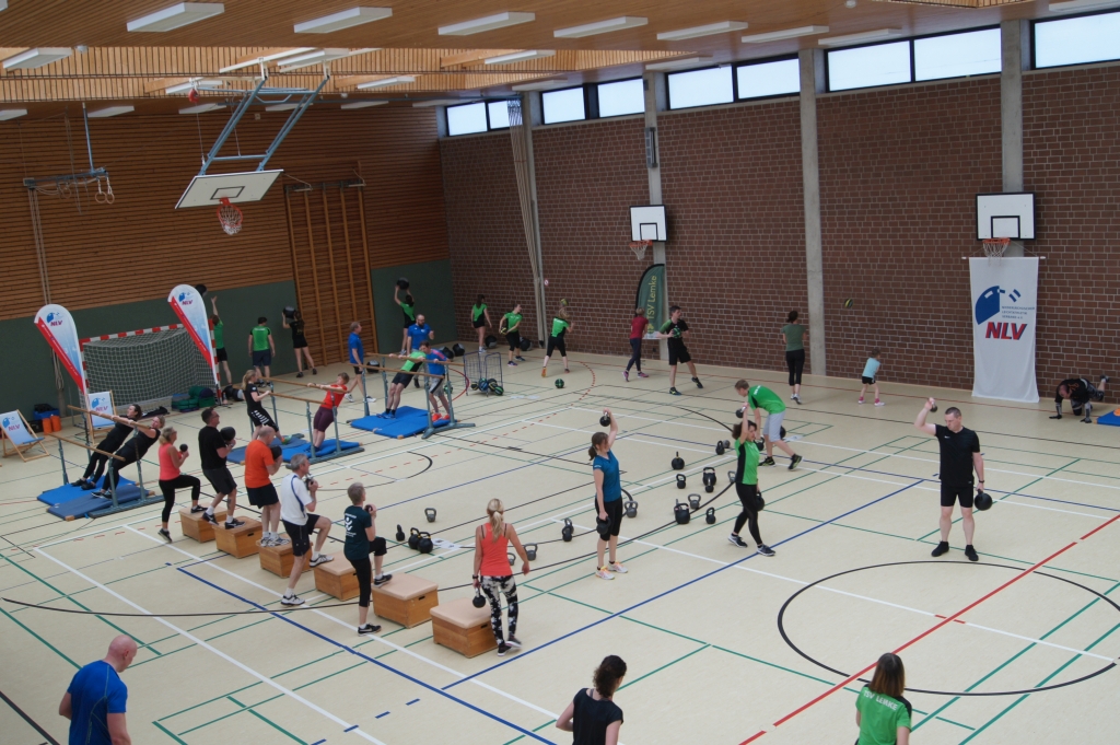 Als das NLV-Team bei der Begrüßung den Preis detaillierter vorstellte, waren die T-Shirts der 42 Frauen und Männer von Anfang zwanzig bis über achtzig Jahre sowie 3 Kinder noch trocken. Viele trugen die Aufschrift „TSV Lemke“, war dies schließlich der siegreiche Verein, doch auch Fitnessbegeisterte aus der näheren Umgebung waren durch den TSV in die Sporthalle Marklohe bei Nienburg eingeladen.