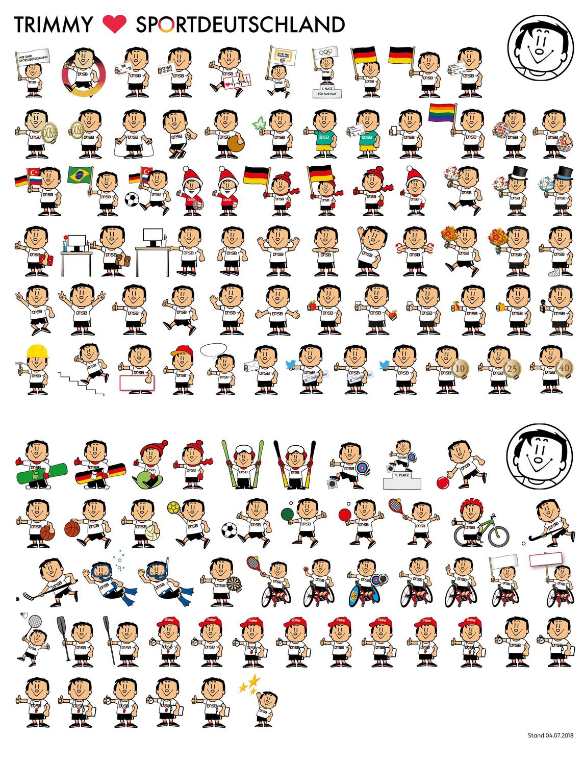 Die Symbolfigur Trimmy wurde übrigens schon am Gründungstag der Kampagne in Berlin als Maskottchen eingeführt: „Er ist kein Supermann und kein Held, ein ganz durchschnittlicher, kleiner, schmächtiger und unscheinbarer Bursche“, so bezeichnete ihn seinerzeit sein Zeichner Dieter Sihler, der mit seiner Agentur die Trimm-Dich-Bewegung für den DSB begleitete. Trimmy trat in unterschiedlichen Rollen als Sporttreibender auf: „Schwimm mal wieder“ und „Lauf mal wieder“ und „Fahr mal wieder Rad“ appellierte er im Sinne des „Sport für alle“. Trimmy ist jetzt 50. Doch dank seines regelmäßigen Sporttreibens strahlt er immer noch im jugendlichen Out-Fit - inzwischen allerdings mit dem DOSB-Logo auf der Brust.