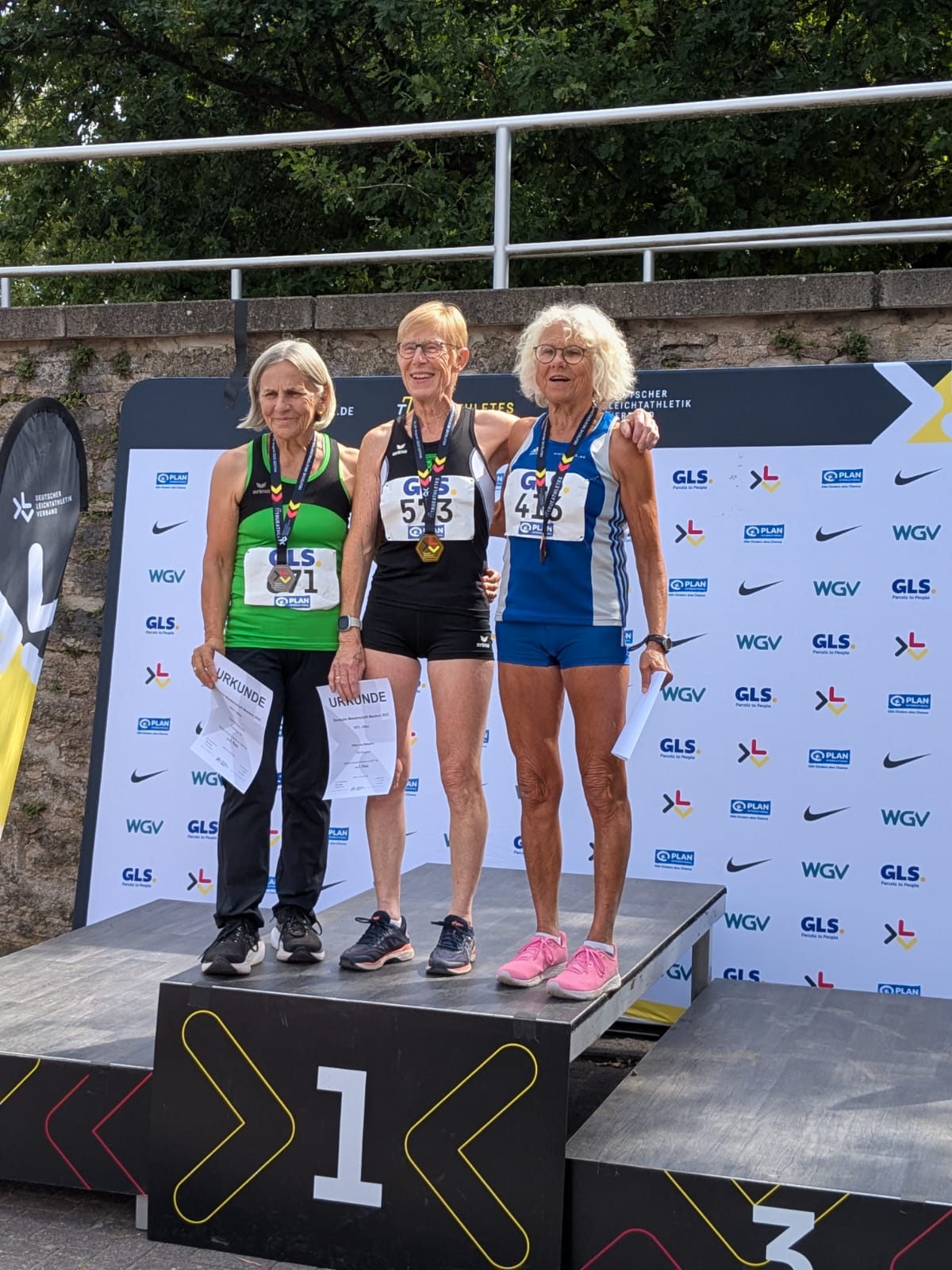 Im Sprungbereich gingen Goldmedaillen auf die Konten der Dreispringer*innen: Während Gabi Bauernfeind vom SV Nienhagen in der W55 auf unbesiegbare 9,30m flog, freute sich M70-Springer Ludger Ammerich (VfL Löningen) über seinen Sprung auf 9,10m. Für Siegermedaillen sorgten auch die niedersächsischen Werferinnen: In der W55 ließ Andrea Mende vom TSV Germania Helmstedt ihre Diskusscheibe auf eine Siegerweite von 32,10m fliegen und im Kugelstoßen der W60 durfte Jana Müller-Schmidt nach ganz oben auf das Treppchen steigen. Die Athletin von der SG Osterholzer LA beförderte ihr Wurfgerät auf 13,03m.