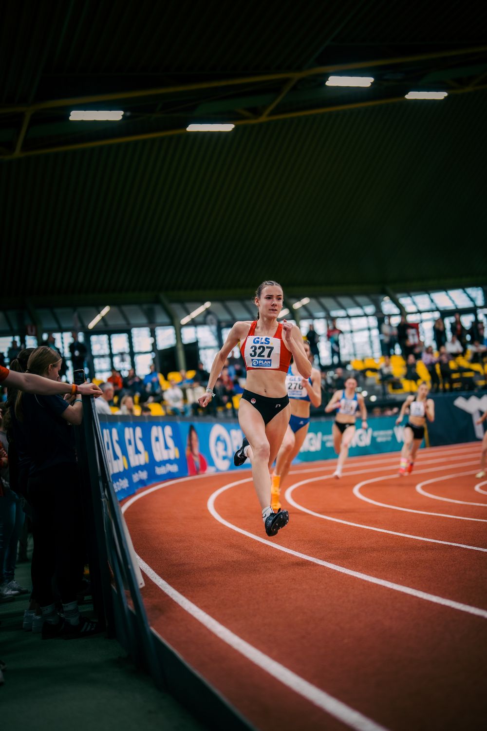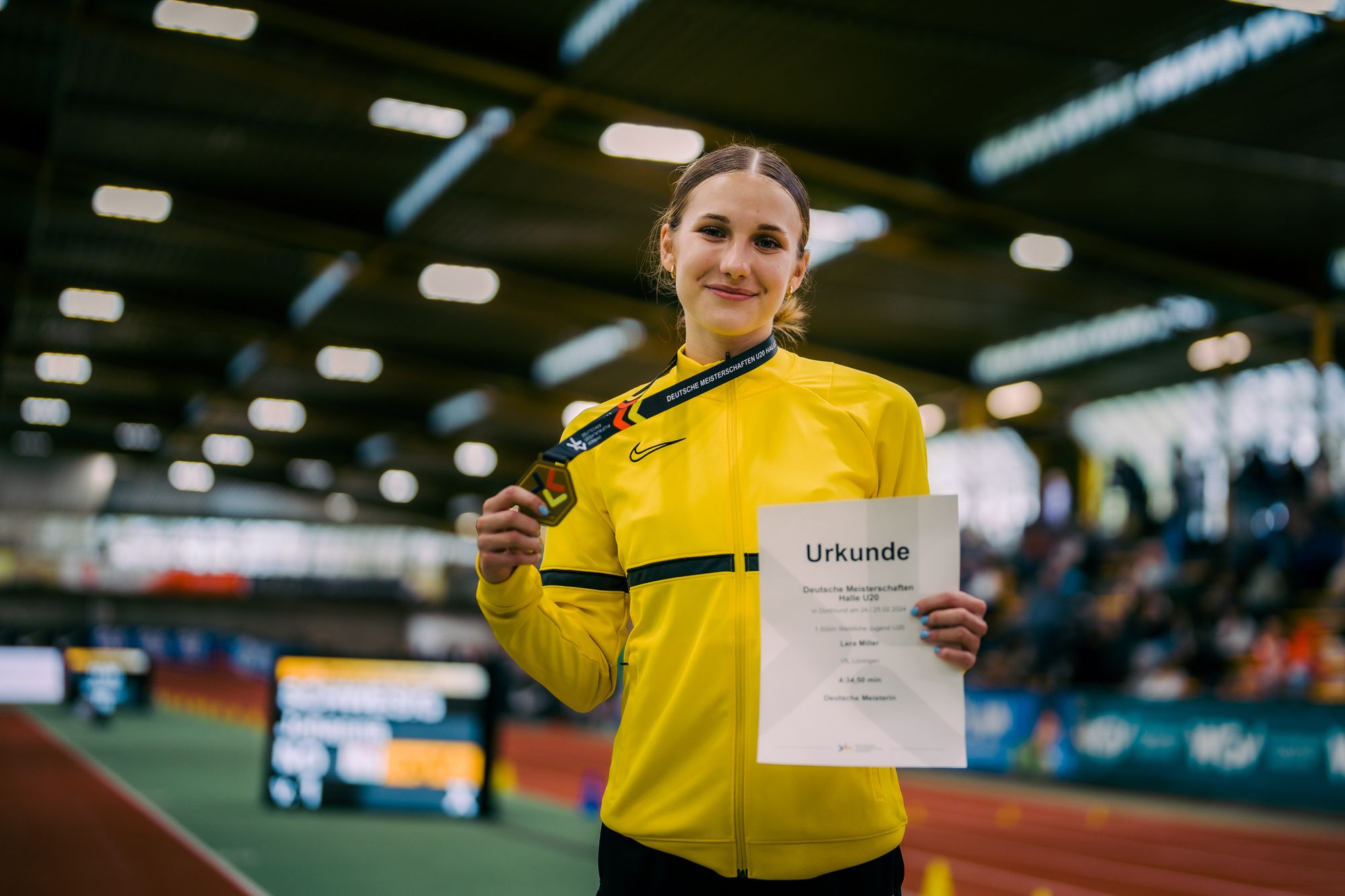 Die noch der U18 angehörende Athletin Lera Miller vom VfL Löningen machte in der so häufig taktisch geprägten Disziplin, den 1500 Metern der weiblichen Jugend U20, alles richtig, ließ sich auf keine Positionskämpfe ein und ging direkt zu Beginn des Rennens mit an die Spitze des Feldes. Auch als die vermeintliche Favoritin Vanessa Mikitenko (SSC Hanau Rodenbach) schon drei Runden vor dem Ziel das Tempo forcierte, blieb die 16-jährige ruhig und versuchte die aufgegangene Lücke zur Führenden langsam wieder zu schließen. Gerade als sie sich zwei Runden vor dem Ziel wieder ran gekämpft hatte, versuchte Mikitenko allerdings mit einem nächsten harten Antritt, die Löningerin erneut abzuschütteln. Die Lücke riss wieder auf. Bis zur letzten Kurve schien der Lauf als entschieden, aber dann verließen der Favoritin durch den frühen Antritt die Kräfte und Miller kam wieder ran und versuchte auf den letzten Metern vorbeizugehen. Mikitenko geriet ins Straucheln, Lera Miller berührte sie leicht, zog vorbei und kam als Erste ins Ziel. Aber was war mit der Berührung? Kurz nach dem Rennen stand Miller tatsächlich aufgrund der Berührung im Endspurt als disqualifiziert auf der Anzeigetafel. Nach genauerem Hinsehen wurde aber deutlich, dass Mikitenko beim Überholvorgang ihren Arm selber nach außen geführt hat und dies zu dem Kontakt führte. So war die anschließende Freude bei Miller umso größer, als feststand, dass sie tatsächlich die Siegerin ist. "Ich habe gedacht, dass der Titel nicht unmöglich ist. Aber meine Hallensaison lief nicht perfekt, ich war krank und konnte gar nicht einschätzen, wo ich stehe", berichtete Lera Miller im Anschluss dem DLV. Anna Malena Wolff López (Braunschweiger Laufclub) und Lotta Lange (Emder Laufgemeinschaft) waren im selben Wettbewerb mit Platz vier und fünf nahe am Treppchen dran und erzielten mit 4:38,63 und 4:38,64 Sekunden neue persönliche Bestleistungen. Bei der anschließenden Siegerehrung war der NLV mit drei Läuferinnen in der Top 8 somit sehr gut vertreten. (Das komplette Rennen im Video).