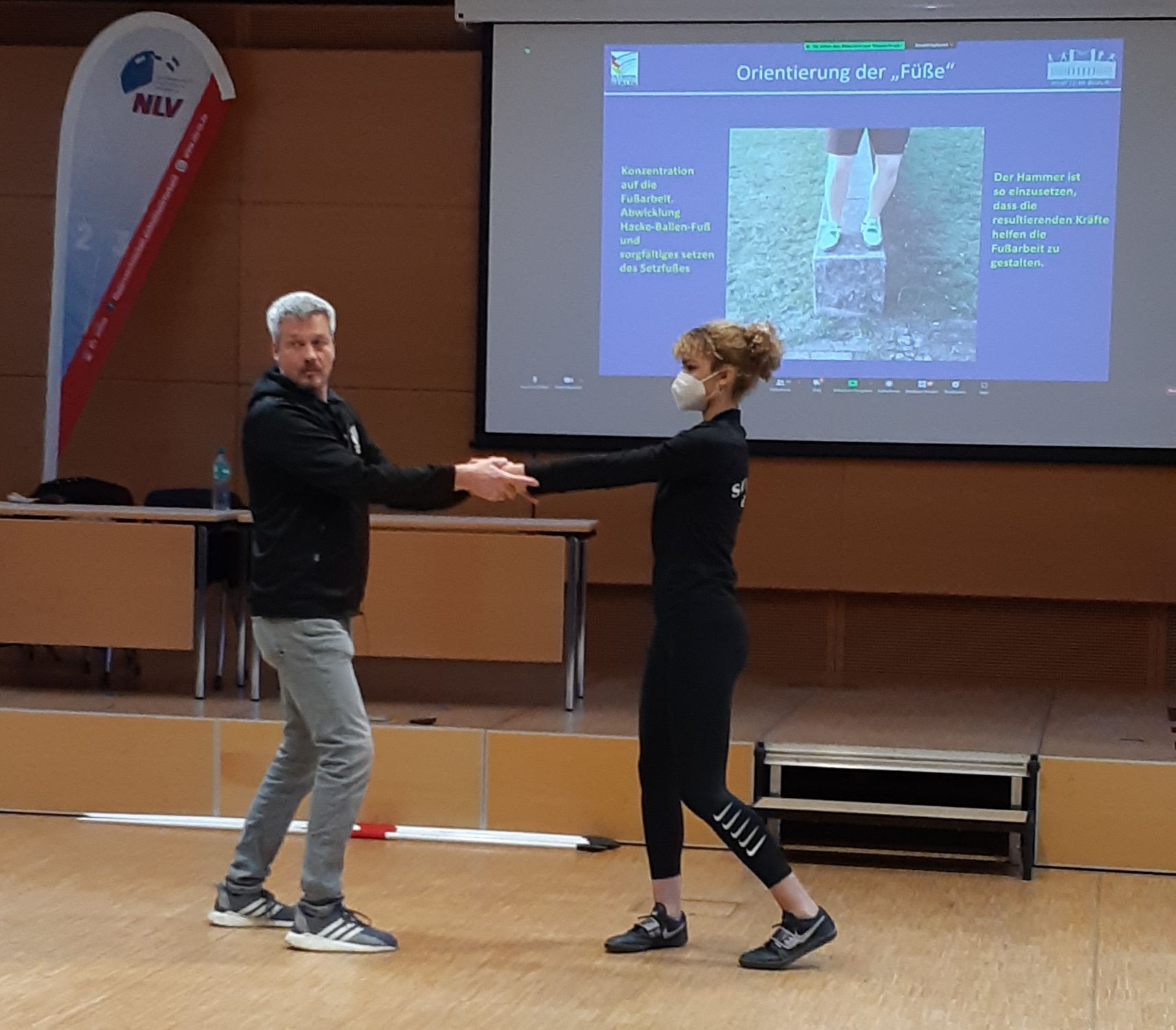 Der Wurfbereich wurde von Thomas Brack, Trainer am OSP Berlin, abgedeckt. Im dritten und letzten Workshop-Block verdeutlichte er anhand der Wurfdisziplinen Speer- und Hammerwurf, dass „Fehlermachen“ als Chance genutzt werden kann und wie umfangreich die „Bewegungsbibliothek“ der Athleten aussehen sollte. Seine Athletin Nova Kienast demonstrierte einige dieser Übungen in der Praxis.